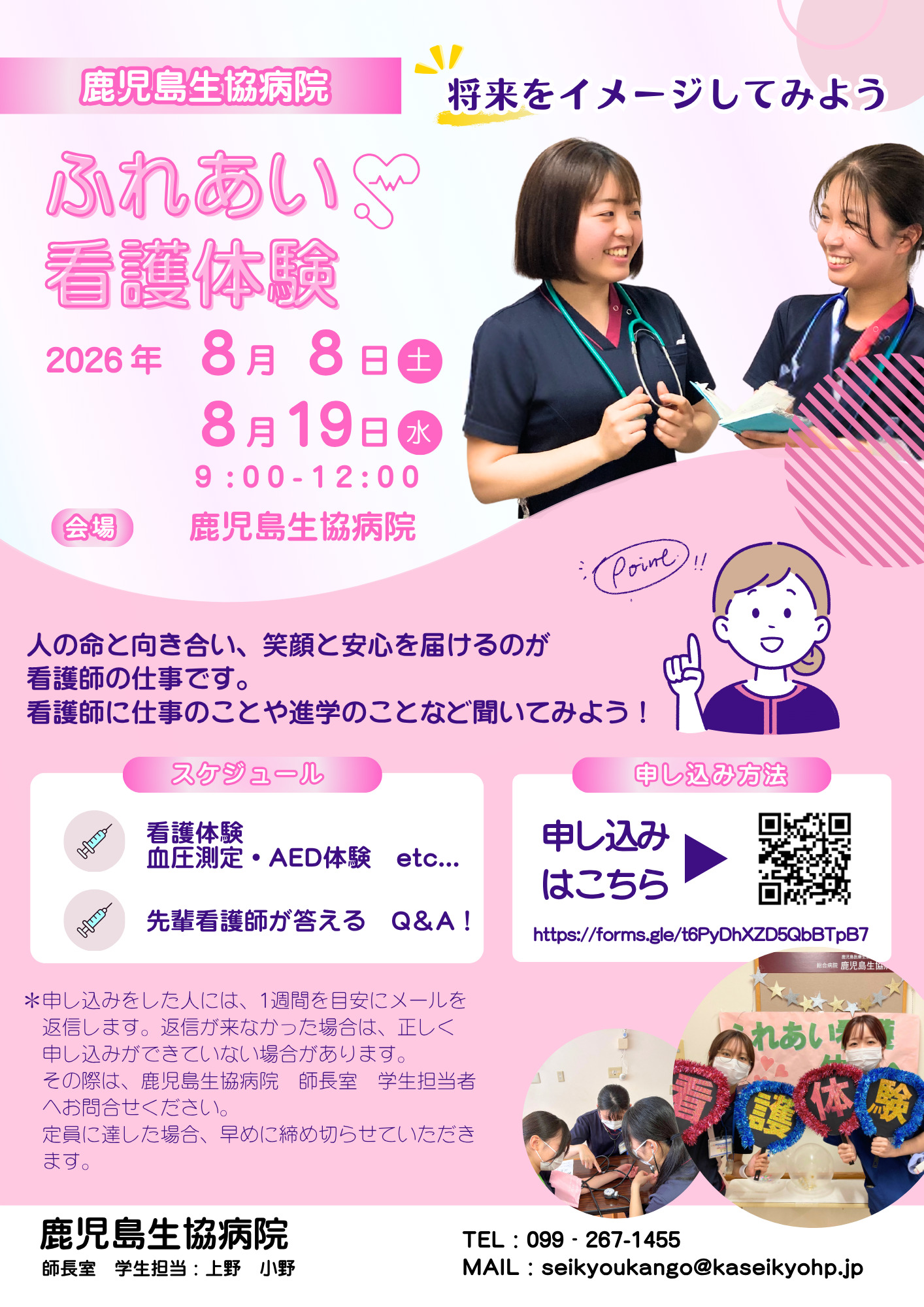 ◆ 内 容:看護体験、血圧測定、AED体験、先輩看護師との交流など